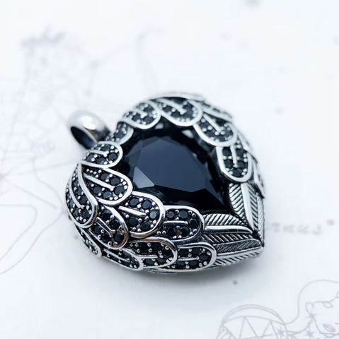 Ce pendentif en argent 925 révèle un cœur noir intense sublimé par un cristal central facetté, entouré de détails en zircon et protégé par des ailes finement ciselées.