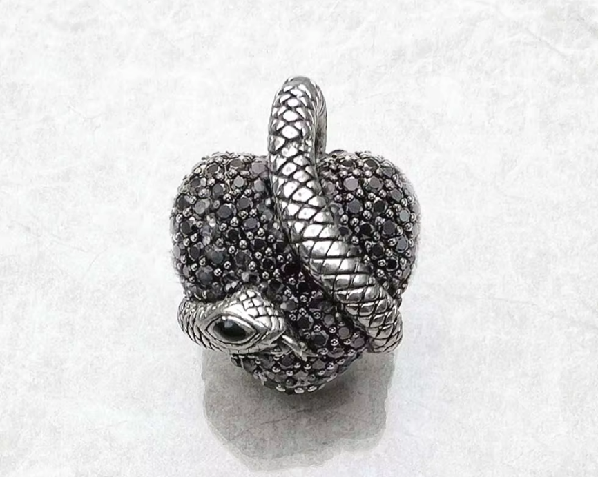 La texture du cœur, dense et scintillante, capte la lumière pour mieux la retenir, créant un éclat sombre et hypnotique. Le serpent, qui s’y enroule avec précision, apporte une dimension mystique, presque envoûtante — comme une force silencieuse qui veille.