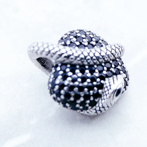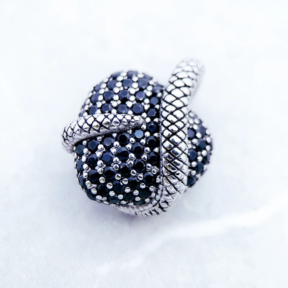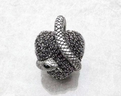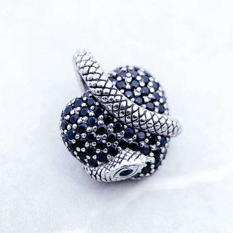 Ce pendentif en argent 925 dévoile un cœur entièrement pavé de zircon noir, enserré par un serpent finement sculpté, symbole ancestral de transformation et de pouvoir.
