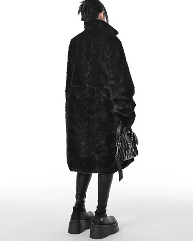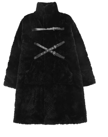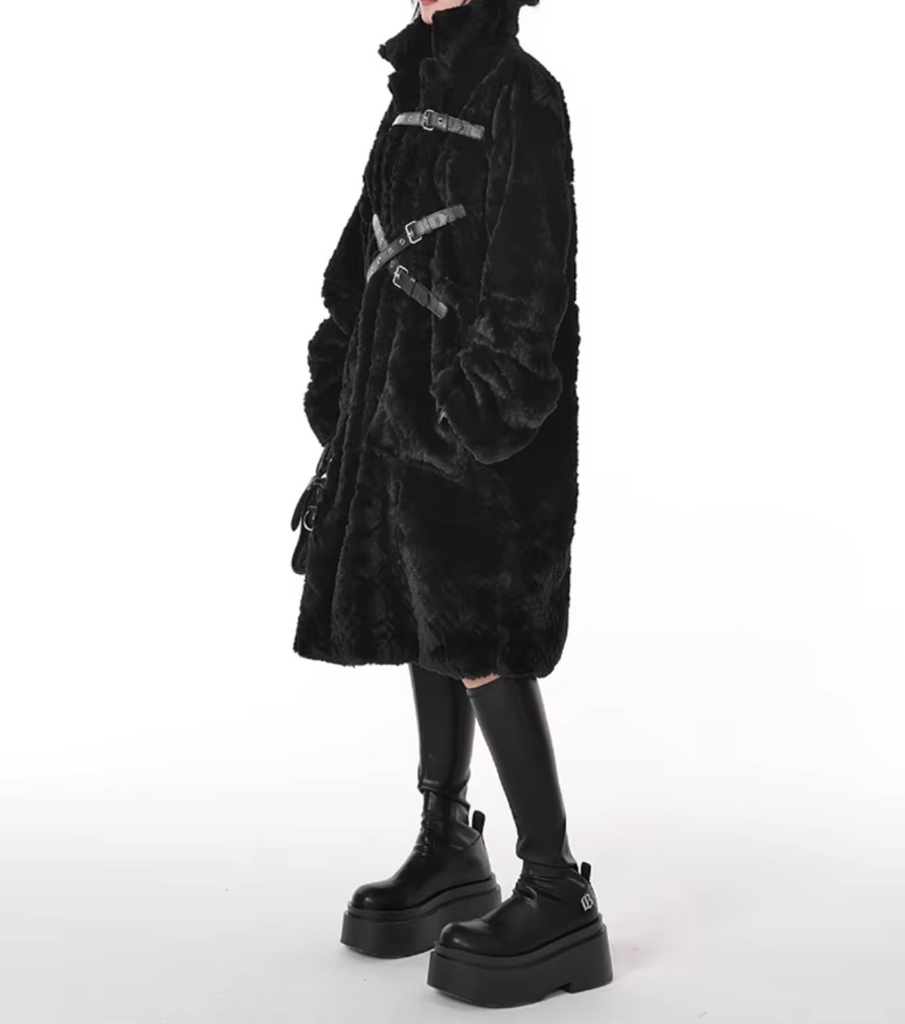 Le manteau gothique « Dark Empress » est une pièce forte qui allie chaleur et caractère. Conçu en fausse fourrure noire douce et épaisse, il assure un confort inégalé tout en affichant un style imposant. Ses sangles croisées à l’avant, inspirées du style bondage, ajoutent une touche audacieuse et rebelle qui fait de ce manteau un véritable statement fashion.