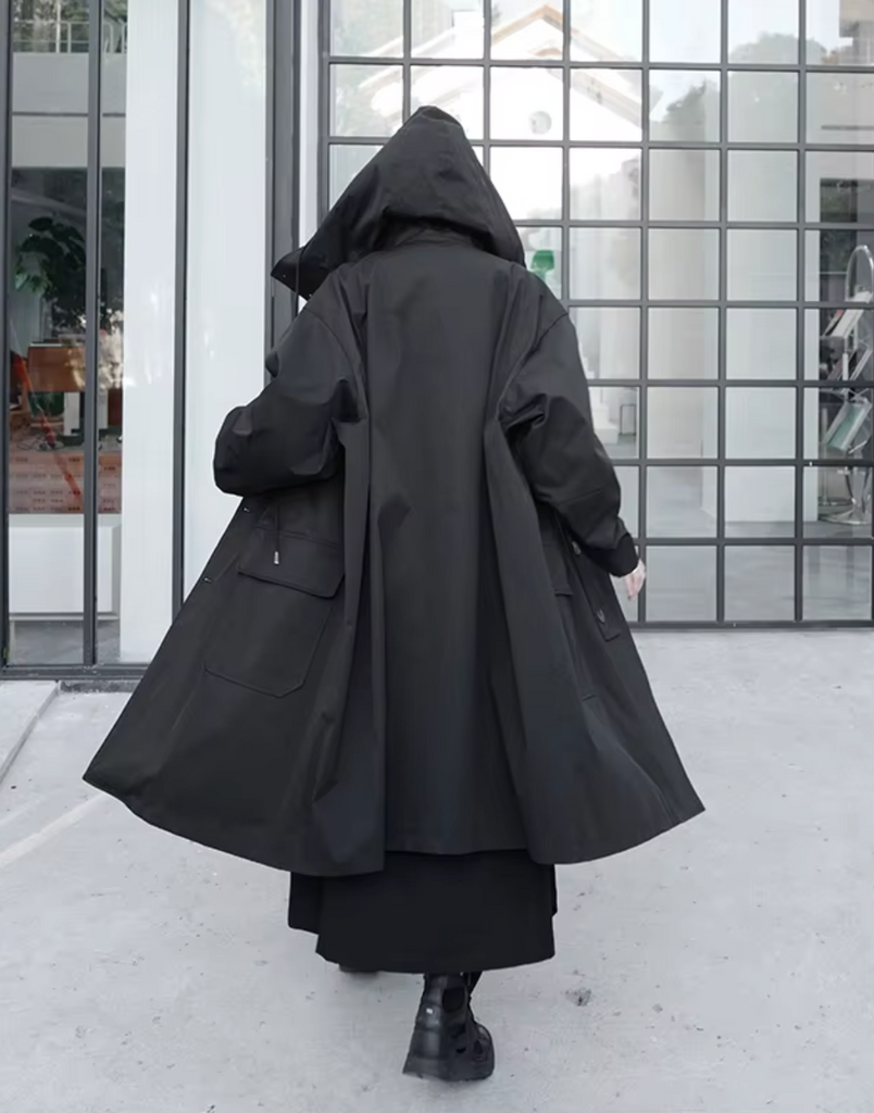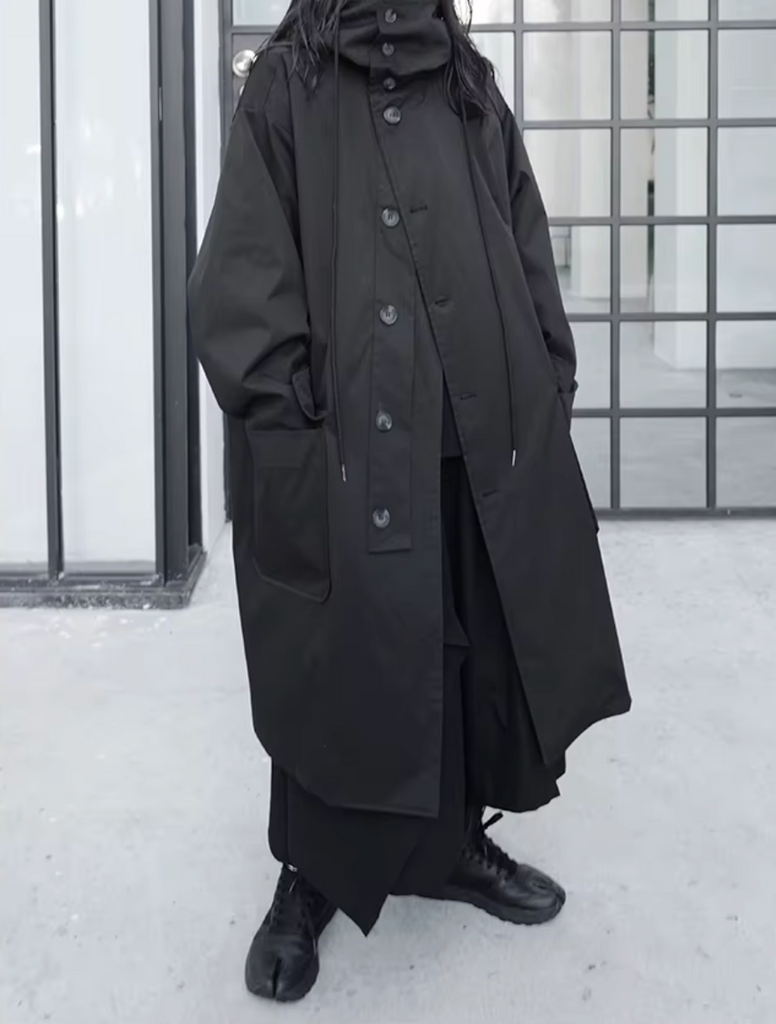 Idéal pour compléter un look gothique, streetwear ou inspiré du techwear, ce trench s’impose comme un vêtement incontournable pour traverser les saisons avec une aura énigmatique.