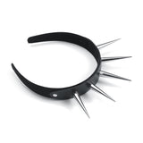 Danger Zone spiked headband. This headband features a black flexible band and a vegan leather band with silver metal tips on top.